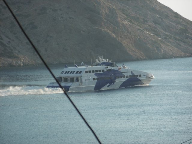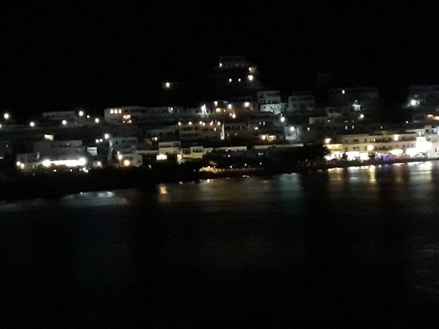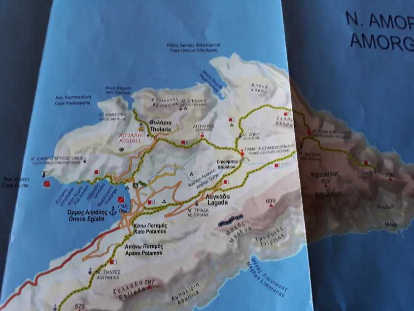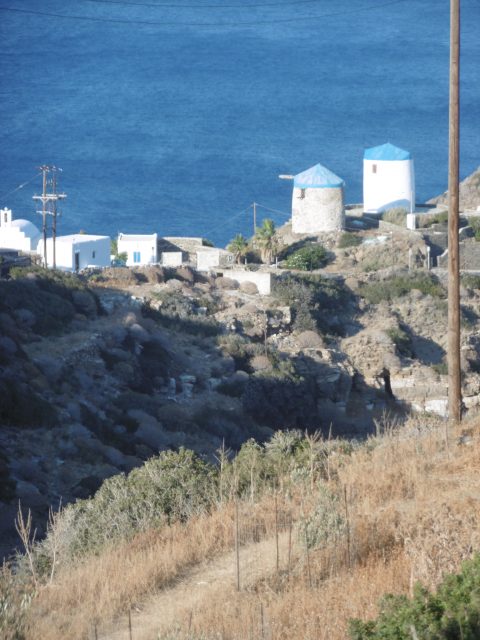 Dans une épingle à cheveux, une belle ferme avec de nombreuse chèvres enfermées dans un enclos. La route s’élève dans la montagne couverte de genévriers arbustifs bien verts. Encore une fois je me demande pourquoi ceux de Naxos et de Milos avaient des aiguilles bleutées. Au détour de la route, de gros oiseaux planent au-dessus d’une décharge – les ordures sont toujours un problème sur une île, surtout touristique. Au débarcadère, enjoint les touristes d’éviter les sacs en plastique.