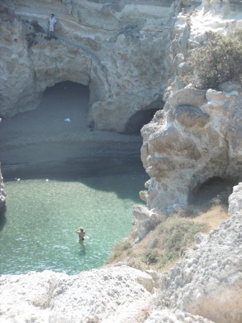 Heronissos est un petit port niché au creux d’une baie protégée. Seuls les caïques des pêcheurs sont à l’ancre, une douzaine de petites barques, un bateau de pêche un peu plus gros, sur des toiles plastiques les filets jaunes sont soigneusement rangés. Une minuscule plage avec quelques tamaris, une cabine pour se changer, deux tavernes et une boutique qui vend des biscuits de l’épicerie de base et des cartes postales. En nageant, je compte les maisons, pas plus d’une trentaine, maisons de pêcheurs et maisons de vacances, rien ne les distingue. Pas de terrasse chichiteuse, du linge qui sèche, des serviettes et des maillots.