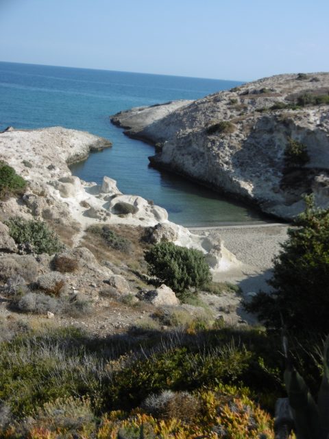 A côté du gite, à Aghia Marina une petite route goudronnée monte vers Aghios Simeon et Troullaki puis rejoint la route principale et gagne Heronissos. La petite route est sinueuse, elle parcourt un paysage désolé d’où on peut observer sur l’autre versant de la vallée les vestiges des mines de fer au-dessus de Kamares. Kamarès était le port du fer avant d’être le débarcadère des touristes. Pierriers rouges dégoulinant de la mine sont bien reconnaissables à leur couleur rouille caractéristique de l’oxyde de fer.