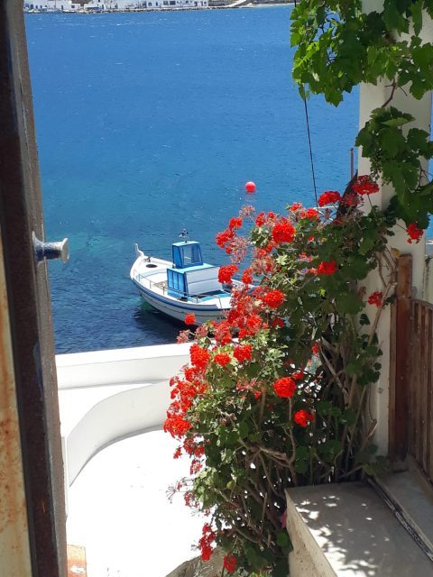 Nous empruntons la même route qu’hier et rencontrons les mêmes chèvres. Le berger n’est pas dans sa voiture mais juché sur un rocher. L’arrivée sur Chora est spectaculaire. Nous recommençons les photos des moulins dans la lumière du matin. Avec le vent, la vision sur les autres îles est très nette. Je n’avais pas deviné la présence d’une grande île . Aujourd’hui, la mer Egée est parsemée d’îles et d’îlots.