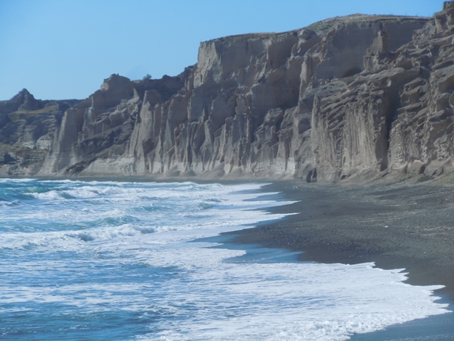 Une coupe stratigraphique décrit l’empilement des différentes strates, couches de cendres, couches de laves sur l’encaissant de phyllites tertaires jusqu’à l’actuel. Le volcanisme a laissé son empreinte depuis 1MA. Du tuf blanc est recouvert de scories rouges puis de plusieurs niveaux de lave sombre, puis de 4 couches de tephras. Un sol fossile contenant des végétaux est daté 18.000ans. L’épaisse couche très claire est celle qui a enseveli Akrotiri (1500av JC)