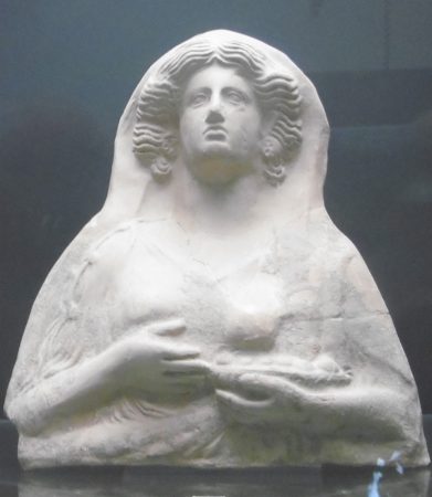 Les statuettes en terre cuite présentant encore des traces de peinture sont présentées avec les bijoux. Ces figurines n’ont pas forcément les prétentions esthétiques des marbres classiques qui répondent à des canons de beauté. Elles en sont d’autant plus émouvantes. Ce sont souvent des femmes. Parfois ce sont des statuettes votives figurant une déesse. Parfois toute une saynète est figurée comme cette naissance d’Aphrodite sortant de son coquillage d’une simplicité merveilleuse. Des mortelles sont aussi représentées dans les scènes de la vie quotidienne, même un couple dans un baiser explicite. Le musée a été récemment rénové et les vitrines sont particulièrement agréables à contempler. Chaque visite regroupe une statuette et des bijoux qui lui correspondent : or précieux pour cette dame élégante drapée dans un tissu plissé…Je suis surprise par les couleurs rose et violine des drapés. Je ne sais pas pourquoi je me représentais les Grecs et les Romains vêtus de blanc. Pas du tout ! Comme pour les bâtiments, ils aimaient la couleur. . Nous avons la chance de contempler 2000 ans plus tard certaines pièces encore très colorées.