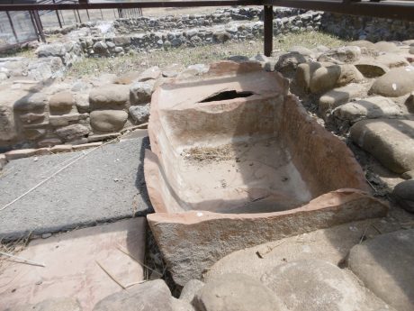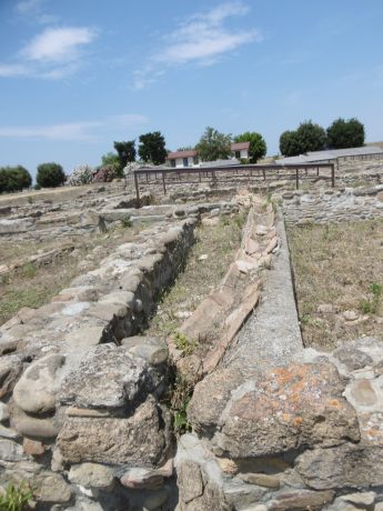 Par un escalier de briques qui soulignent ainsi la position de la ville haute, je suis montée sur l’Acropole d’Hérakeia, où j’ai été surprise par la densité du bâti (ou ce qu’il en reste). Les fondations sont bien visibles. Les mosaïques sont protégées ainsi que l’intérieur des maisons. Cependant l’absence de cartels m’a laissé sur mes pauvres hypothèses personnelles. J’observe les canalisations en terre cuite, des structures arrondies avec une margelle (puits ou citerne ? peut-être des pressoirs ? A quoi correspond ce cylindre de pierre au milieu de la structure arrondie ? Et ce sol carrelé en terre-cuite était-il à l’intérieur de la maison, ou un patio ? Cet évier en terre cuite ? J’élabore des hypothèses sur la récupération des eaux de pluie avec une citerne par maison et des rigoles. C’est un peu frustrant de rester avec tant de questions sans réponses.