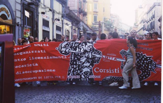 Bandiera Rossa, les Partisans, l’Extrême Gauche a sorti son répertoire, deux voitures, un mégaphone, deux banderoles un service d’ordre efficace mais bien peu de manifestants, quelques centaines peut être un millier en étant très optimiste. Quand on sait combien il y a de chômeurs à Naples !