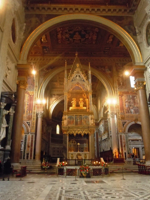 L’intérieur a gardé l’aspect voulu par Borromini en 1650 : 5 nefs et un plafond plat à caissons dorés. Dans les niches sous les piliers, les 12 statues des apôtres furent exécutées par des disciples du Bernin, spectaculaires mais plutôt froids.