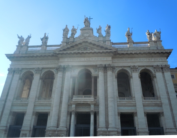 La façade blanche est surmontée de 15 statues blanches de 7 m de haut qui se voient de loin. Du Janicule, on remarque ces pointes blanches. Le fronton triangulaire est classique avec des balustres et deux portiques. Cinq grandes arcades correspondent aux cinq nefs, ainsi que les 5 portes.