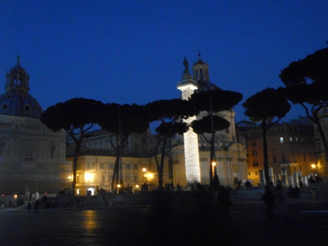 Le retour est épique. Je pensais que le tram n°3 allait jusqu’à la gare du Trastevère où nous retrouverions le tram n°8. Erreur ! il s’est arrêté à la Pyramide et à la stazione Ostense et puis est reparti vers le Colisée. De là nous pensions trouver de nombreux autobus pour la Piazza Venezia et là le n°8 dans l’autre sens. Nous ne savions pas que, le samedi, les Fori imperiali sont piétonniers : pas d’autobus, il faut marcher à pied. C’est une très belle promenade au pied du Colisée qui s’éclaire et entre les forums illuminés mais nous sommes épuisées et avançons avec comme cap, la colonne Trajane et le sapin de Noel !