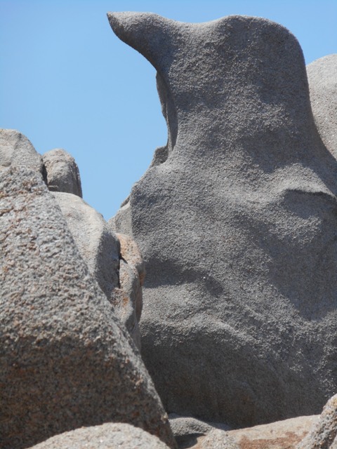 Nous préférons visiter le Capo Testa, presqu’île faisant face aux Bouches de Bonifacio reliée à la ville par une sorte de tombolo séparant deux plages magnifiques mais très fréquentées. Le Capo Testa est sillonné de chemins pédestres que nous négligeons faute de temps et dans la chaleur de midi, pour poursuivre jusqu’au phare. Enfin, nous nous autorisons une pause et une promenade dans les rochers spectaculaires où l’érosion a sculpté des volumes étranges. Des cavités régulières ont été évidées. Certains rochers rappellent des têtes monstrueuses. On imagine des profils humains, des animaux. Je photographie un pingouin géant. Chaque fois le granite se détache sur le bleu profond du large ou sur une crique turquoise. C’est un enchantement. Il y a du monde, l’accès à l’eau est difficile, la chaleur écrasante. Rien n’y fait. Je suis conquise.