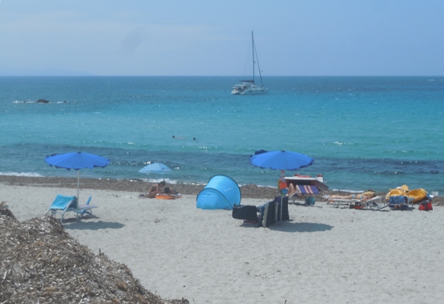 Le circuit propose d’autres visites. Cherchant Portobello, nous parcourons une petite route pour la trouver barrée d’un portail « resort ». Privé ! On ne passe pas. Mêm scénario un peu plus loin à Val Erica . C’est agaçant de faire des détours pour rien. Frustrant. Le littoral a-t-il été entièrement privatisé ? Heureusement non. La troisième tentative est la bonne sur une route très étroite, très tortueuse, à travers le maquis touffu vers la Plage de Liscia. Nous trouvons une plage occupée par les véliplanchistes. Le vent souffle fort. La surface de l’eau est hérissée de vaguelettes. Un peu plus loin, une très longue plage de sable borde la baie arrondie. Quatre énormes yachts attendent. J’essaie de nager le long de la ligne de bouée qui protège les nageurs des incursions des planches et des bateaux. Je nage vigoureusement pour…faire du surplace. Je croyais arriver à la tour de guet du maître-nageur et je suis toujours devant le petit tas formé par mes tongs et ma robe de plage. Impossible de nager contre le vent. Je marche dans l’eau qui m’arrive jusqu’à la poitrine jusqu’au bout de la plage. Pour rentrer le courant me porte sans effort.