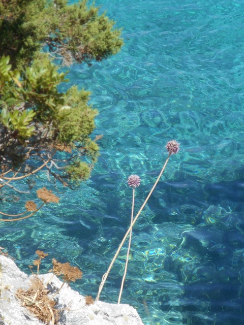 Un peu plus loin : départ pour la Grotte de Neptune par les marches. Les voitures brillent au soleil. Encore une fois, la foule me dissuade. Un endroit peut-il rester paradisiaque avec tant de badauds ? La visite est chère (12€). J’ai hâte de me baigner. Sur la Carte du Parc régional, je remarque une plage après la Villa Romaine (fermée). Un parking naturel dans une clairière sous les pins, un sentier, la mer quelques dizaines de mètres plus loin. Hélas les galets sont inconfortables et je n’aime pas me baigner complètement seules. Je continue le sentier sur le rivage jusqu’à la plage d’un hôtel et nage non loin de là, rassurée.