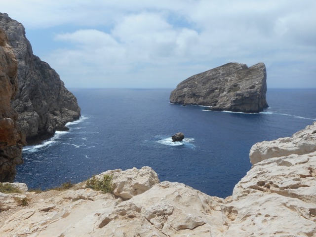 La route du Cap Caccia se divise « route panoramique » et route de la grotte. Sur la route panoramique nous trouvons l’emplacement de notre festin, sur un petit rebord au dessus du précipice, face à des falaises calcaires. Un petit rocher rond se trouve au centre de la baie fermée par le Cap et l’Ile. Les vagues sont très impressionnantes ; l’eau bleu marine très foncé se gonfle avec la houle. La surface mouvante va se fracasser en écume menthe glaciale. On ne se lasse pas du spectacle.