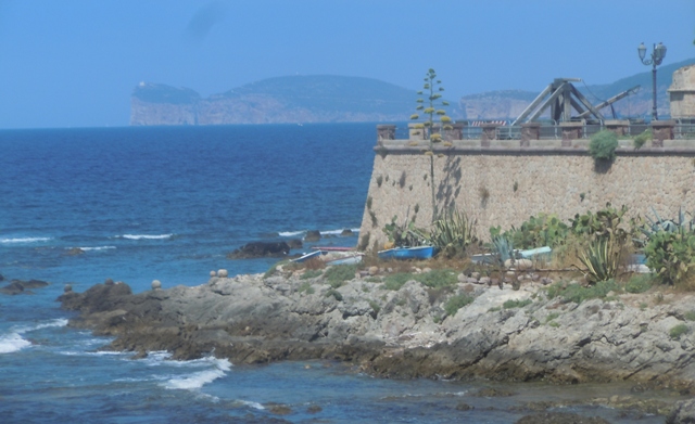 Les tours se succèdent certaines, 14ème siècle, d’autres 16ème. Par les créneaux on voit les beaux voiliers de la marina. Certains yachts sont de taille imposante. Ils ne me font pas rêver, m’agaceraient plutôt. A l’horizon les falaises du cap Caccia nous attirent. Nous irons y pique-niquer !