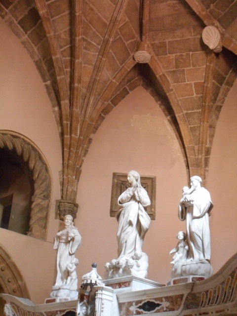 L’église San Francisco m’a beaucoup plu : les arcatures gothiques soulignées par des cordes marines sont-elles catalanes ? J’ai vu les mêmes au Portugal ; marines en tout cas. Les marbres blancs de trois statues de Gian Battista Franco (1773) – la Vierge entourée de Saint François et de Saint Antoine – sont perchées sur un autel polychrome qui évoque plus un bateau qu’une table. Je n’ai pas trouvé le cloître charmant et paisible vanté par le guide Vert.