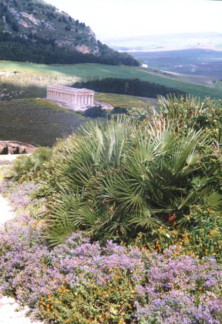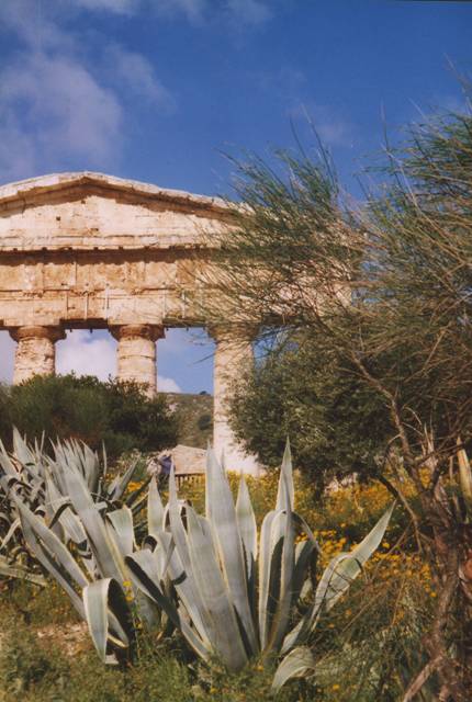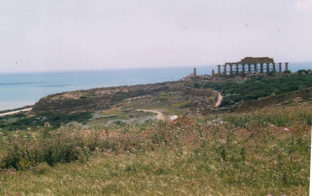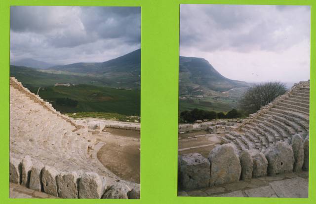 Ciel bleu, déjà à 8h30, des nuages se bousculent sur les montagnes. De chaque côté de l’autoroute, les blés verts ondulent comme les vagues d’une mer verte. Dominique se cramponne au volant se la Punto. Ces autoroutes sur pilotis offrent un paysage magnifique sur les collines mais les rafales y sont dangereuses. A la fourchette nous prenons la direction de Trapani et découvrons Ségeste après un long tunnel. Ségeste