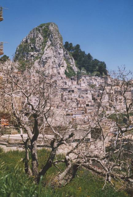 Bien qu’on n’ait pas dépassé 1000m, le paysage est celui de la haute montagne : herbages et buissons d’euphorbes, petits pics rocheux comme des chicots. Me rappelant la route entre le Dévoluy et Valence. A l’entrée de Caltabellotta des cavités sont creusées dans une falaise, on dirait un pigeonnier cappadocien. Ce sont les nécropoles sicanes, les premiers occupants de la Sicile.
