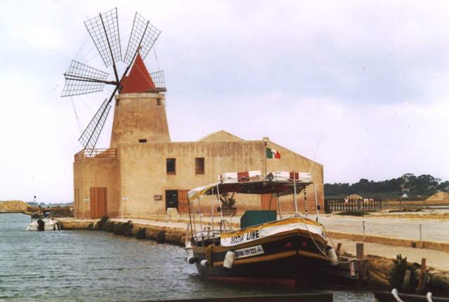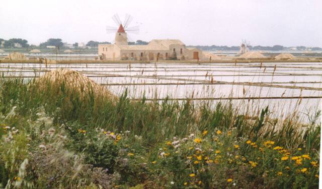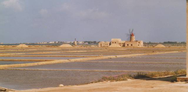 Les îles de Stagone et Mozia sont très proches du rivage. Les tas de sel sèchent sous des tuiles rondes poreuses , en pyramides régulièrement alignées le long de la route . Les moulins forment des alignements en diagonale. Certains ont gardé leurs ailes en bon état mais sans les voiles. La route suit le littoral jusqu’à Marsala .