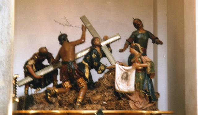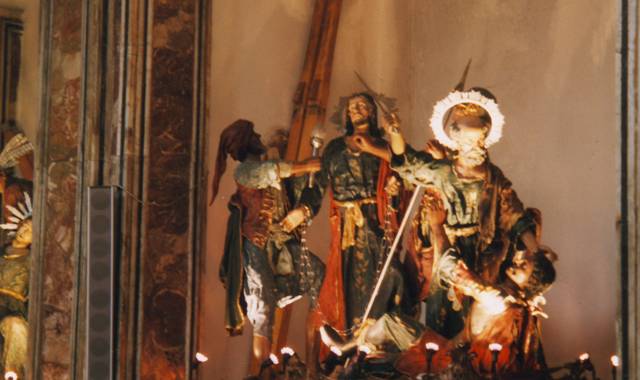 Nous laissons la voiture sur un vaste parking et nous dépêchons de rejoindre la Chiesa del Purgatorio où sont déposés les Mystères : groupe de statues représentant la Passion que l’on promène toute la soirée et la nuit du Vendredi saint. Dominique Fernandez a écrit un chapitre entier à leur sujet et a aiguisé ma curiosité ? Comme dans le livre, l’église est fermée. Pourtant les horaires placardés sur la porte sont les bons. Je vais me renseigner dans les boutiques voisines ? Le vieux fleuriste debout sur le pas de sa porte me dit que c’est fermé pour nettoyage, je m’étonne, il mime le balayage. Entre-temps la porte s’ouvre devant Dominique. J’accours. Les nettoyeurs sont là, raclette sur un long manche, ils grattent le carrelage. Nous faisons quelques pas en avant, « Non, c’est fermé, revenez cet après midi ! » Nous regardons donc de loin les groupes de statues très réalistes dans une église vide qui fait un peu hangar.