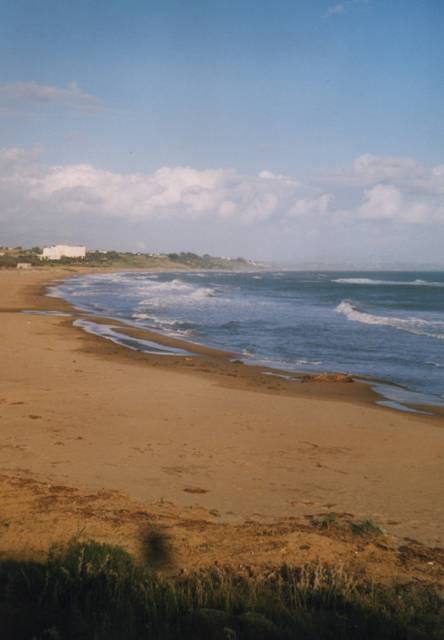 Entre Marsala et Mazzara del Vallonous cherchons une plage pour déjeuner. et nous arrêtons derrière Pétrosino. Nous montons sur l’autoroute pour éviter Mazzara et en sortons à Campobello di Mazzara, bourg désert, peu attirant et plutôt sinistre sous le ciel gris à l’heure de la sieste.