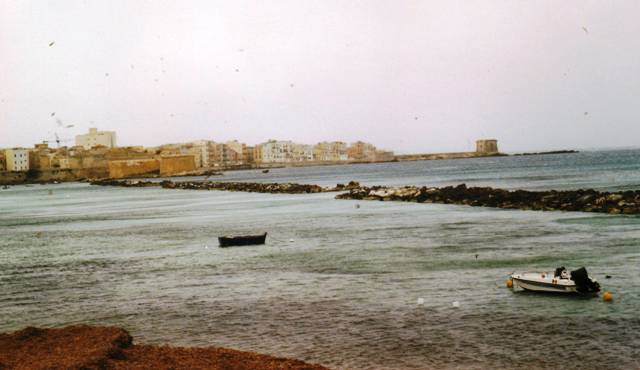 La pluie a laissé sur la voiture de vilaines taches de poussière. A Mazzara del Vallo, le temps est couvert. Nous laissons la voiture sur le Lungomare Mazzini qui est une jolie promenade plantée de platanes qu’on est en train d’élaguer sur le bord de la mer ; sur l’autre trottoir, des ficus et des palmiers donnent un air exotique.