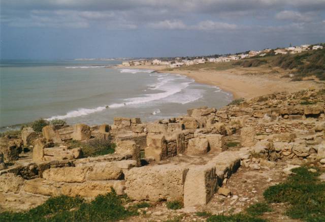 u sommet du Monte Barbaro des ruines plus récentes : les fondation d’une mosquée rectangulaire et un fort normand. Le théâtre grec curieusement ne s’adosse pas à la colline mais il est complètement construit. Il paraît tout petit et pourtant contient 4000 spectateurs. Comme à Epidaure, il s’intègre dans le paysage de montagnes splendides. Une rénovation récente, (2001) a relevé tous les gradins ? Nous ne profiterons pas du calme longtemps .les scolaires remplissent les gradins, se photographient. Finalement, dans un théâtre, des spectateurs, rien que de très normal !