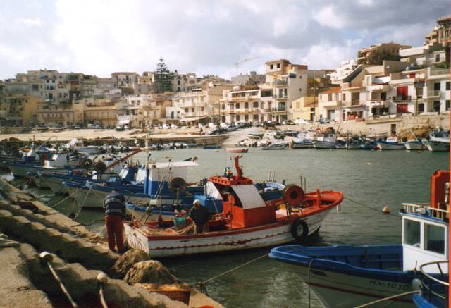 Sciacca est une ville en pente ! Nous descendons au port, très actif. Il y a, en fait, trois ports : un port de pêche pour les petits bateaux, un port de plaisance, petit, un dernier pour les gros bateaux. Les digues avancent dans la mer en dessinant des triangles. L’eau est d’un bleu magnifique, lisse. Le ciel, sans nuages. C’est une belle journée !