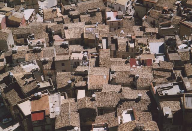Caltabellota surgit au dernier moment, blottie sous trois éperons rocheux. Les maisons sont tassées les unes contre les autres. Les toits de tuile s’enchevêtrent. Je pense à Moulay Idriss et à ses deux collines avec la différence qu’au Maroc les maisons étaient d’un blanc éclatant tandis qu’ici elles forment un camaïeu beige rosé, ocre et jaune.