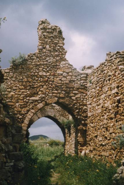 Je descends de voiture pour prendre photo sur photo. La route dépasse un plateau herbu où est plantée une grande croix qui s’avance dans le vide ? En face : les reste d’une construction gothique, normande sans doute. Après bien des lacets, nous parvenons sur une esplanade ? Il faut continuer à pied et grimper les marches herbues pour atteindre une petite église San Pellegrino : portail baroque délicat avec d’étranges nymphes nues. Accolé, un bâtiment plus fruste, tout en longueur, avec des ouvertures régulières est adossé à la montagne. Il me fait penser à ces monastères grecs inaccessibles qu’on ravitaille avec des paniers suspendus à de longues cordes ? Est ce un monastère ou le château où se réfugia Sibylle, femme de Tancrède de Hauteville à la suite de la guerre entre Souabes et Angevins déclenché par les Vêpres siciliennes ? Dans ce château, en 1302, le traité de paix fut signé. Lequel est le château ? Peut être les ruines près de la croix ?