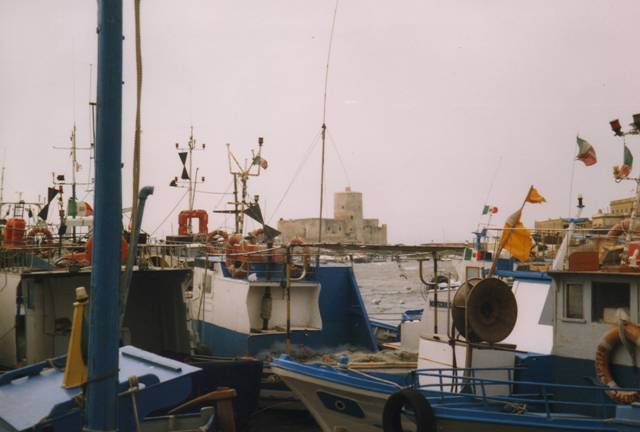 Nous nous promenons au hasard dans les rues très calmes, les rues principales : Corso Italia, Corso V Emmanuele ou Via Garibaldisont bordées de palais aux balcons en arceaux. Les petites ruelles sont plus agréables pas de voitures et surtout pas de vent. Vers la pointe de la flèche les maisons sont plus simples, toutes pareilles, sans balcons ni ornement. Les façades sont peintes de très belles teintes ocre, jaune, beige, sable parfois rouges. Seules les lanternes de l’éclairage public se détachent sur ce camaïeu aux couleurs du désert. Une digue est terminée par une tour carrée : la Tour Ligny. La mer est déchaînée. Pour rentrer, nous essayons de suivre les quais du port : Bateaux de pêche, ferries pour les îles Egades et même quelques très gros bateaux. Le vent projette du sable et même des petits cailloux. Des Vespas sont renversées. Nous tenons à peine debout, peinant pour avancer. Si on se réfugie dans les ruelles, j’ai peur que les inévitables échafaudages ne s’écroulent sur nous. Cela ressemble à un vent de sable au Maroc ou au khamsin. Peut être est ce le sirocco qui vient de Tunisie ?