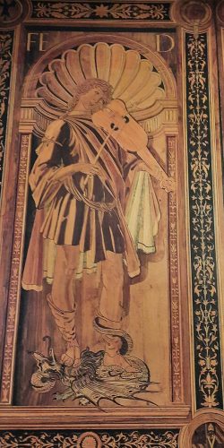 Cette écriture arabe décore la bouteille de forme orientale sur la sculpture des trois acolytes. Un échantillon de Lapis-lazuli, en provenance d’Orient est présenté, il donne les bleus de la Maestà.