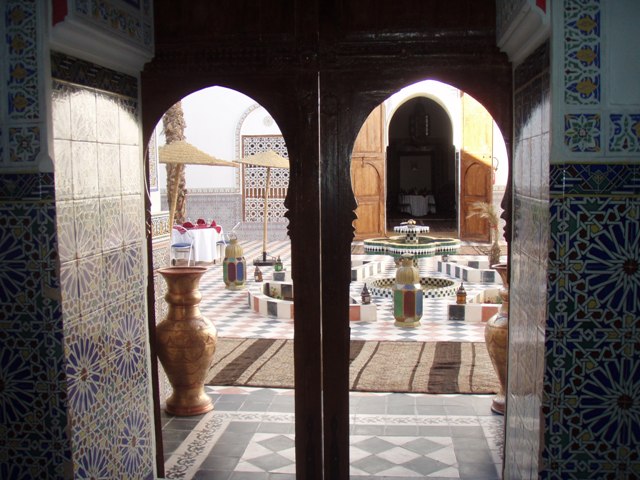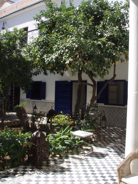 La porte s’ouvre sur un patio exquis : une fontaine abritée par un auvent de tuiles vernissées, un rigole carrelée mène à un bassin central encadré par quatre orangers figurant le plan traditionnel des riads. Deux palmiers au feuillage léger, deux citronniers dans des jarres. Ce patio est exigu mais il est ravissant, décoré de stuc et d’entrelacs peints ; des salons le bordent sur trois côtés. Les fenêtres des chambres sont protégées par des ferronneries compliquées.