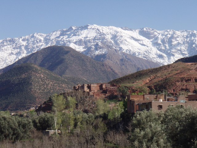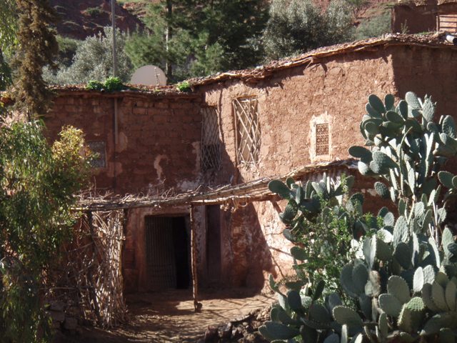 Le sentier part en face de la Villa de l’Atlas entre l’auto-école et une maison. Il grimpe tout droit dans la colline. Un âne et son ânier sont montés quelques minutes plus tôt. Je suis leur passage entre les maisons. Ce n’est pas facile de savoir où passe le sentier et ou finit la courette ou le jardin. J’ai peur d’empiéter sur le domaine privé de toutes ces constructions mal définies. Hommes et femmes vont et viennent, souriant à mon passage. Très peu de chiens (un seul que je fais semblant d’ignorer). Plus je monte, plus les maisons sont simples. Plus de crépi. Des roseaux et de la terre coiffent les terrasses et les murs. La dernière maison du hameau possède un four à l’extérieur très grossier, ses fenêtres sont maquillées de blanc à l’ancienne. Une grande parabole occupe la terrasse.