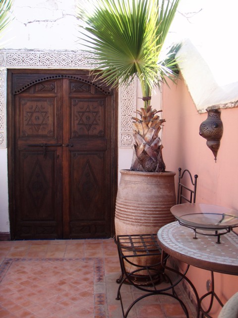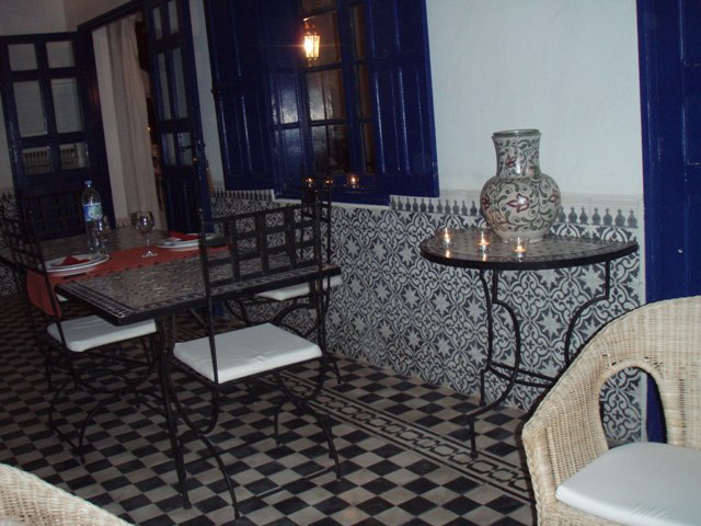 Yannick, est un hôte fort sympathique. La décoration intérieure est son oeuvre. Il a trouvé ce riad du 18èpe siècle en mauvais état mais il recelait des trésors : les portes de bois sculptées, les stucs du patio ainsi que les coquilles au dessus des fenêtres…Nous visitons les autres pièces, autres styles autres couleurs, tout de très bon goût. Je termine la soirée sur la terrasse toujours aussi éblouie et intimidée.