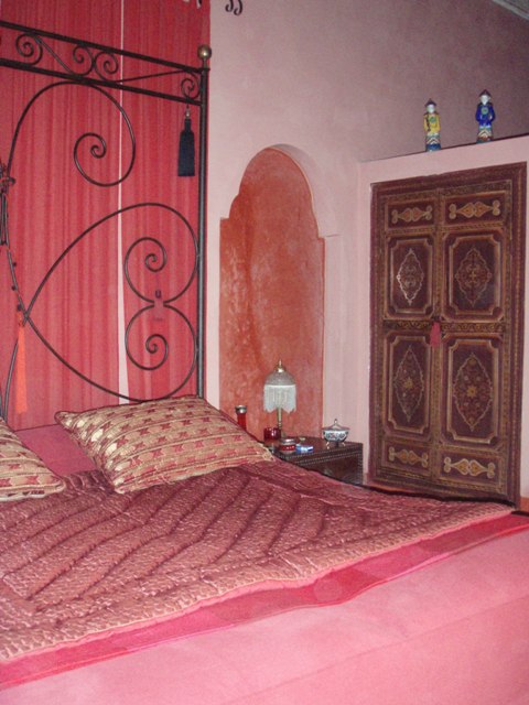A l’étage, un salon à arcades sous la galerie sépare les chambres Mogador et Marrakech. Notre chambre, Marrakech, est aux couleurs de la ville rouge. Toute une symphonie de rouge : un immense lit au couvre lit de satin floqué posé sur un jeté brillant, sur un autre plus grand rouge et or. La tête de lit de fer forgé en volutes est tendue d’un crépon léger carmin. On a suspendu des pompons de soie grenat et noirs. La glace reflète ce camaïeu rouge et les murs roses comme les murailles de la ville. De part et d’autre de la glace les fenêtres peuvent être occultées par des volets intérieurs de bois. L’amusant est qu’on peut les fermer ou les ouvrir par moitié. Au dessus de l’embrasure de la fenêtre : une coquille de stuc, fleur à sept pétale. Chaque pétale est décoré d’un motif géométrique extrêmement sophistiqué.