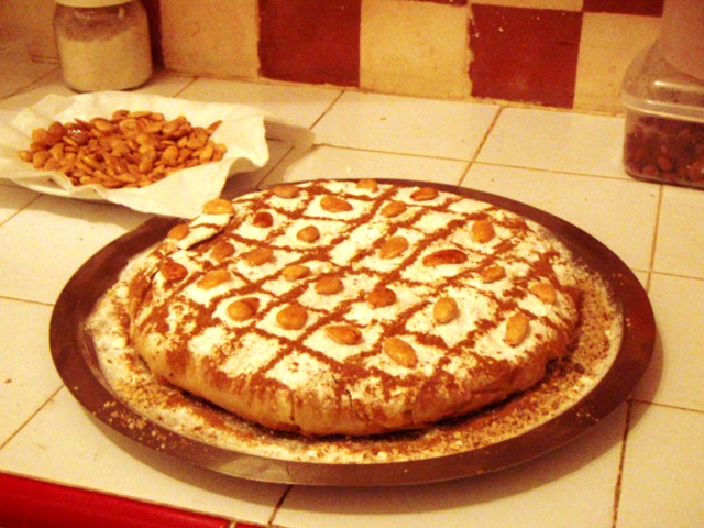 Notre dernière soirée est un peu ternie par la découverte de l’addition. La vie de château, nous l’avions oublié, se paie. Raisonnablement au Maroc. Mais plus que nous ne le pensions. Quand je comprends le décompte je préfère oublier le total. C’est dommage parce qu’Amina s’est surpassée. Elle a cuisiné une Pastilla dont elle est très fière. La Pastilla est pour moi un mythe raconté par les Juifs marocains. Depuis quarante ans j’en ai entendu parler sans y avoir jamais goûté. Enfin, je vais pouvoir la connaître. Amina tient à ce que je photographie le feuilleté ovale décoré au sucre glace et à la cannelle qui dessine une résille brune. A l’intérieur, un fin hachis d’amandes et de pigeon (poulet ?). L’entrée était également sucré : un bol de riz au lait et à la cannelle. Les fraises apportent un peu de fraîcheur et d’acidité à ce dîner gastronomique un peu trop doux.