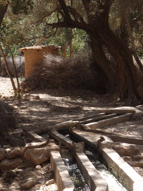 Deux rigoles parallèles correspondent l’une à l’eau de la source, l’autre à celle du bassin qui ne se mélangent pas. L’irrigation est très compliquée. Lahcen nous emmène au bassin rectangulaire rempli qu’au tiers et où prospèrent des algues vertes. Il se remplit la nuit quand on n’irrigue pas. L’eau de source n’est pas gaspillée et ne court pas inutilement. Lahcen nous montre la canne-jauge entaillée de nombreuses rainures. Chaque trait correspond à cinq minutes. Chaque famille a droit à une part d’eau que l’on marque d’un lien d’herbe verte coincée dans l’encoche. Les anciens tiennent colloque pour la répartition qui varie chaque jour en fonction de la durée de remplissage la nuit du bassin. La canne-jauge doit toujours être plongée au même endroit. Elle est sacrée.