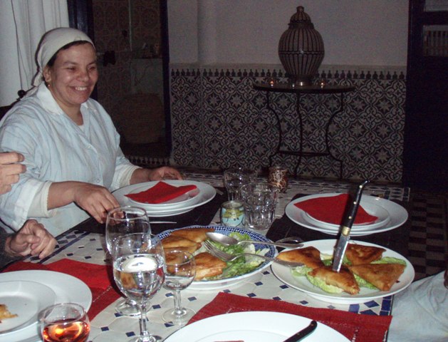 Amina découpe un poulet qui va mariner dans du citron avec du persil et des épices en quantité. Ensuite elle va fourrer des feuilles de brick avec de la viande hachée. Dans la poêle mitonne la viande, du beurre et du persil avec toutes sortes d’épices, elle taillade à même, l’oignon entier. Nous prenons une leçon avec une très bonne cuisinière. Amina ne pèse rien, ne goûte pas non plus. Elle verse de tout en abondance, elle renifle les épices ajoute par cuillers entières le cumin, le gingembre, le poivre qu’elle trouve dans des bocaux, une bonne pincée de safran (pour le goût) une cuiller d’un colorant (pour la couleur) Rien n’est pesé. Tout est mélangé avec force. Cuisiner à la marocaine pour deux personnes est un non-sens. Elles préparent des quantités monstrueuses de nourriture qu’elles partageront entre elles et nous. Même après ce partage ce qui arrive sur la table suffirait pour six personnes. C’est délicieux mais nous en laissons toujours plein.
