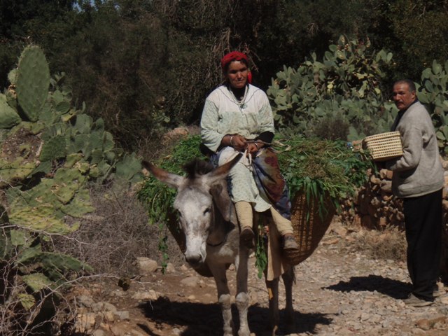 Ici, les femmes ne sont pas voilées. Elles portent un foulard, bien sûr. Leur visage est découvert. Elles nous sourient et ne se cachent pas. Certaines sont très belles avec des habits très colorés. Pour les photos, elles opposent un non catégorique. Lahcen va chercher la selle de l’âne en toile pour Dominique. La table sera en paille tressée : les grands paniers du bourricot. Latifa a mis nos salades préférées : les carottes pour Dominique, les pommes de terre, tomates et poivrons et aubergines. Elle a aussi mis des keftas parfumées au persil et aux épices. Le dessert est cueilli sur place.