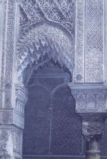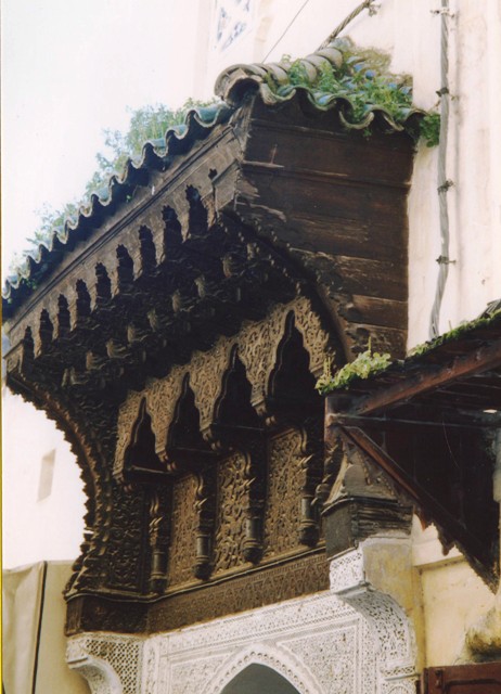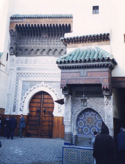 La clepsydre me plaît de plus en plus depuis que j’ai lu que des cymbales sonnaient les heures et que des oiseaux mécaniques surgissaient des petites fenêtres. Le « juif astucieux » dont parlait le guide, n’est autre que Maïmonides (pas seulement astucieux, l’auteur du guide aurait pu se renseigner !) Il aurait trouvé le mécanisme hydraulique de cette horloge monumentale qui occupe tout un bâtiment en face de la Medersa Bou Inania (visitable selon les livres mais fermée pour cause de travaux).