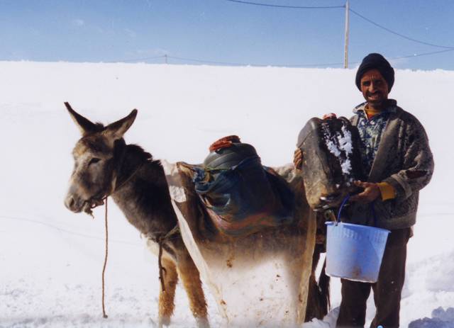 Les villageois sont sortis : avec des pelles ils débarrassent la neige des toits. Les ânes sont bien utiles. Toutes les pistes et petites routes sont sous une épaisse couche de neige, cela ne les gène pas. Ils sont très photogéniques. Je photographierais tout : les maisons rouges qui se détachent, les ânes et les âniers, le minaret rose qui se détache sur le ciel bleu. Les gens d’ici sont très occupés avec cette neige et ont mieux à faire qu’à nous importuner.