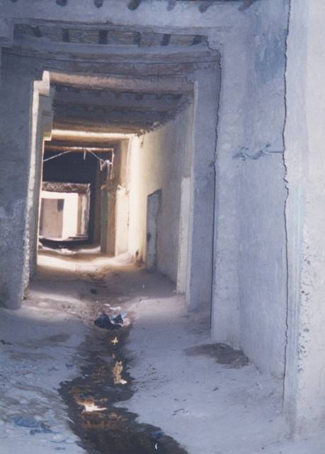 Nous traversons des passages couverts étroits avec un caniveau au milieu, rempli d’eau après la pluie. Grâce aux bonnes œuvres d’Hillary Clinton, cette casbah bénéficie de l’électricité et de l’eau courante (à la fontaine). Malheureusement, le puits profond de 60 m est à sec, le seau en caoutchouc à pneu est encore suspendu mais lorsqu’on se penche, on ne voit pas d‘eau.