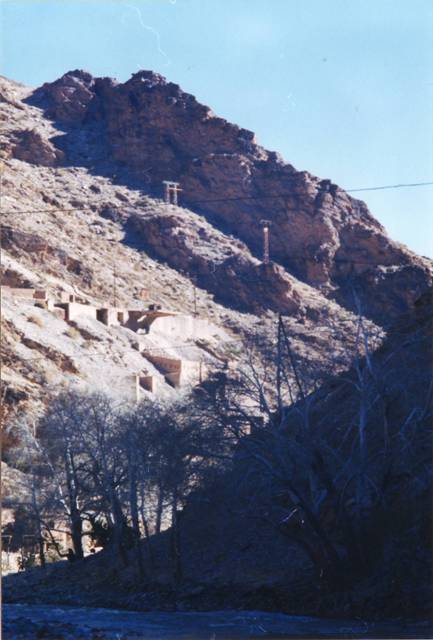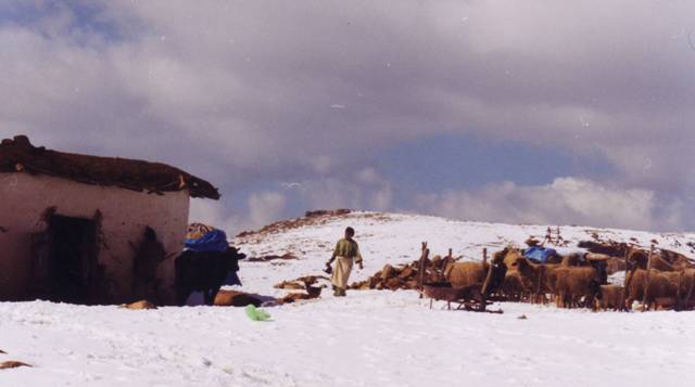 La route suit d’abord l’Oued Moulouya dans une large plaine labourée par un énorme chantier, une mine à ciel ouvert ? De gros tas de remblais rouges jonchent le bas côté, ce qui défigure le paysage. Insensiblement sous nous élevons et la neige blanchit complètement le sol. D’épaisses congères de neige s’accumulent. Derrière nous plus au Sud, la grande barre du haut Atlas avec ses forets et ses sommets. Un chasse neige passe. L’oued devient petit ruisseau dans la neige. Des maisons aux murs de terre rouge très bas soutenant un toit qui dépasse.