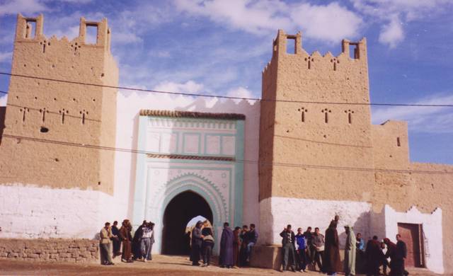 Rissani est beaucoup plus calme qu’hier soir. Quand nous arrivons au Mausolée de Moulay Ali Chérif, le fondateur de la dynastie alaouite, la dynastie actuelle, la place est vide, les portes monumentales fermées. Un jeune homme à grande allure, djellaba bleu nuit très élégante fait signe à un soldat en faction qui nous ouvre les portes. Il nous fait un topo sur le mausolée (tout neuf, il a été reconstruit dans les années 1950 après une crue du Ziz, puis rénové en 1997), nous explique les différents motifs des décors en stuc : la Main de Fatima, spécialité des artisans fassis, dans les zéliges, les deux carrés entrelacés de la Mecque, bleus. Nous ne pouvons que jeter un œil au patio et au jardin (quatre carrés représentant les quatre saisons), le tombeau et la zaouia restent cachés aux non-musulmans .C’est un lieu de pèlerinage, ceci explique l’affluence hier, vendredi d’après l’Aïd. Le jeune homme ne demande aucun pourboire, c’est un commerçant qui nous invite pour le thé après la visite de la casbah voisine.