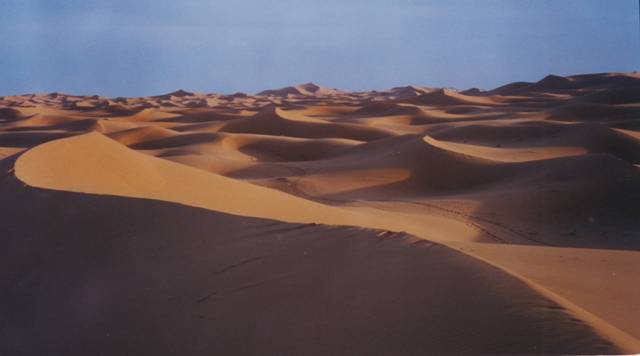 Progressivement, mes yeux s’habituent, je distingue le relief, l’arrondi de la dune, nous suivons une arête, le chamelier marche sur le rebord sans se retourner. Direction plein est vers la lueur de l’aube. Sans y prendre garde, les dunes de l’Erg Cherbi se dévoilent. Je m’aperçois enfin que les étoiles ont complètement disparu. Je pense à la définition du début du jour quand on distingue un fil noir d’un fil blanc.