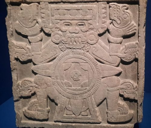 Depuis 1978, le Templo Mayor fait l’objet de fouilles archéologiques dont cette exposition rend compte. Avant de découvrir les fouilles, il convient de se familiariser avec la cosmogonie mexica : les deux calendriers qui coïncident tous les 52 ans, représentés sur des disques sculptés, les quatre ères, le récit mystique de l’histoire mexica et ses dieux . Le dieu patron Huitzilopochtli les a guidés par un présage divin : un aigle dévorant un serpent sur un cactus.