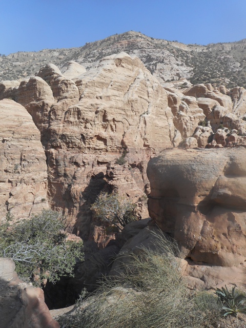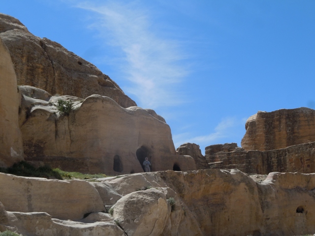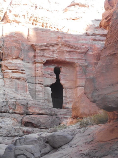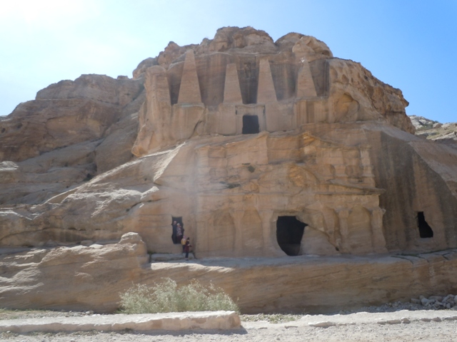 Pour cette deuxième visite, je prends mon temps pour lire les panneaux. Les grands cubes à l’entrée seraient les pierres des djinns. De l’autre côté de la route se trouve le Monument à obélisques . Chaque obélisque (ou pyramide effilée) serait un Nefesh (une âme) tandis que dans des niches le long du parcours dans le sik on a creusé des niches pour les betyles (idoles) . je suis à la recherche d’un bétyle représentant Al-Uzza schématisé avec des ronds pour els yeux. Ces pierres sont des idoles dans des niches au musée il est expliqué que Betyle s’écrit Beit =maison) il (el=divinité).
