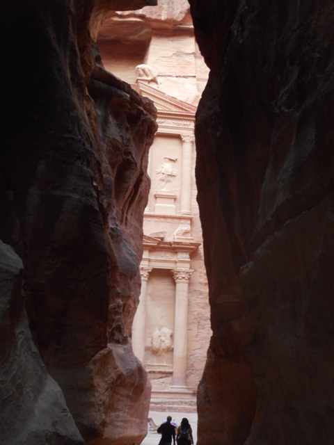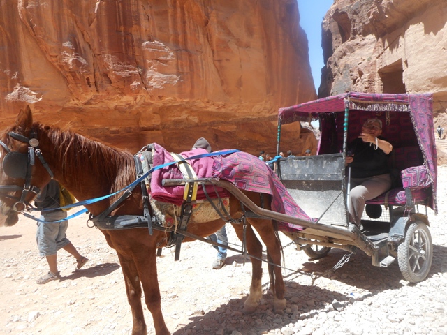 Comptant rentrer déjeuner vers 13h, je me trouve à midi devant le Khazneh. Dominique m’appelle. Elle est venue à pied avec sa béquille. Nous rentrerons en carriole. Inutile d’essayer de marchander : le prix est fixe : 20JD. La carriole est petite avec sa capote violette. Le cocher partage la banquette avec nous. Il conduit à la voix « Rrhhah ! rrhhah ! » ce qui doit vouloir signifier « au galop ! au galop ! ». il peste contre les passants qui ne se poussent pas assez vite. J’aurais préféré une balade plus tranquille pour profiter du sik.