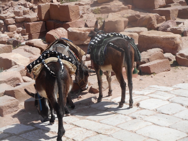 A midi, le site était vraiment bondé. Je n’ai aucune envie d’y retourne dans la chaleur. Vers 16h, c’est le reflux. Les conducteurs des chevaux n’ayant plus de clients à faire monter (c’est compris dans le prix du billet mais il faut prévoir le bakshish). Désœuvrés ils s’amusent et font la course sur la piste sableuse, on se croirait sur l’hippodrome du temps des romains ou des byzantins ! En galopant, ils soulèvent la poussière. Les carrioles sont très prises dans le sens des retours, dans la descente je pense aux chars de Benhur !