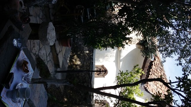J’écris assise sur un siège de pierre, accoudée au muret sous un agrume non identifié en fleur (citron ou orange ? ) une dizaine d’arbres soigneusement taillés, au tronc chaulé poussent entre les dalles. Deux oliviers dépassent les orangers, un petit grenadier tente de se frayer une place. Dans des poteries, des plantes vertes ; les sièges sont maçonnés grossièrement ; Il y a aussi une chaise longue en bois et deux fauteuils de fer forgé très confortables. Des jarres « antiques » complètent le décor.