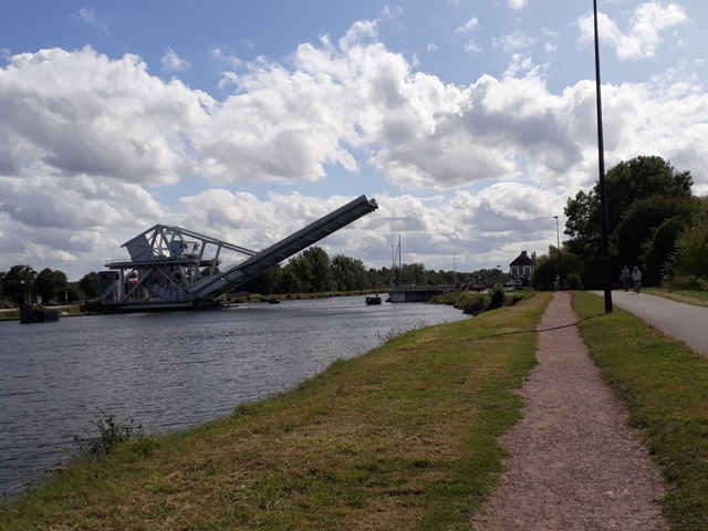 Nous rentrons donc contrariées à Ouistreham . Dominique s’installe sous le phare et j’emprunte le chemin de halage le long du canal. Cet itinéraire est une Voie verte – une vélo-route – partagée par les cyclistes et les piétons (cyclistes nettement majoritaires). Ils sont de toutes origines, personnes âgées et enfants, hommes et femmes, familles ou sportifs…Certains équipages sont impressionnants : des charrettes à enfants sont tractées par les parents qui ont aussi le vélo chargé de nombreuses lourdes sacoches. Parmi eux beaucoup d’Anglais, des Hollandais bien entendu, mais les Français sont nombreux à pédaler pour des vacances itinérantes. Après Caen, la route verte se dirige vers La Rochelle. Il existe un autre itinéraire suivant le littoral de la Manche vers le Mont Saint Michel. Je croise le groupe classique des grands parents accompagnés de deux ou trois petits enfants, ceux là ne sont pas chargés, c’est sans doute une balade de la journée. Peu de cyclistes en mode sportif, les maillots des clubs et cuissards, nous les verrons dimanche matin sur les routes avec les autos. Je marche jusqu’au Pont Pegasus, promenade plate un peu monotone. Près du pont : gros attroupement. Le tablier se soulève majestueusement pour laisser passer deux grands voiliers. La route reste coupée un bon quart d’heure causant un embouteillage monumental.