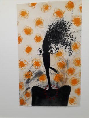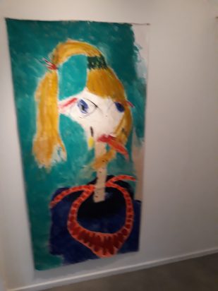 De grands tableaux souvent sur des toiles sans cadre représentent le visage d’une femme sur un fond le plus souvent laissé blanc, de grands yeux dépassent du visage, cils et sourcils hérissés, cheveux en toupet ou en pétard ; elles tirent la langue. Certaines sont blondes aux yeux bleus. D’autres sont noires. Toutes les Nanas ont un sacré caractère. Je les aime bien mais je trouve l’exposition un peu répétitive. Je regrette l’absence des collections permanentes. Certes, je n’ai pas été privée de Collioure après la grande exposition Derain à Pompidou.